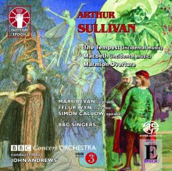 The second disc follows the model of the first in presenting the complete incidental music to a Shakespeare play—here, The Tempest—with all the acting parts voiced by Simon Callow. The only exception are the roles of Ariel and Ceres which are spoken/sung by the ideally light-voiced and agile Mary Bevan. For one single section, track 18 (Act IV Scene 1), she sings a duet with Fflur Wyn as Juno. Unlike the Macbeth music composed on the hoof to fit the demands of a specific production, The Tempest is elsewhere listed as Sullivan's "Op.1". It was produced as an extended suite of 12 pieces to accompany the play as part of Sullivan's graduation work in Leipzig. At the examination concert in 1861, Sullivan presented six of the twelve sections. Unlike the Macbeth performance, this tends to be more an orchestral or vocal section, tied to the next with an interconnecting excerpt from the play. It is therefore easier to choose to focus on just the music by skipping the usually brief dialogue. Callow stays accent-free, which I prefer. The liner notes include no texts spoken or sung, but given the admirably clear enunciation no texts are ultimately necessary. Perhaps because Sullivan was writing music for his own mind's-eye idealised version of the score, he was able to write in a more unrestrained manner. For sure, the sheer orchestral, melodic and dramatic brilliance of the writing makes it easy to understand quite why he burst onto the British musical scene at the age of 21 with this score. Again, the playing and the recording here are very fine—alert and sensitive throughout. Listen to the beautifully flowing lyrical No.4 Prelude to Act III for an early example of Sullivan's great melodic gift [this section is included in the 'standard' instrumental suite]. On disc The Tempest has been more popular than Macbeth. Aside from this new disc, there are extended suites from Vivian Dunn with the CBSO on EMI, Richard Hickox with the BBC PO on Chandos and Richard Stern in Kansas City on Reference Recordings. I know the first two performances, though not the third, and they are both very fine. But in this instance the presence of the extra music and especially the vocal sections make the Dutton disc preferable.