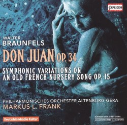 The main work here is Don Juan, which was premiered in 1924 by Wilhelm Furtwängler, no less. He was but one of several important conductors who performed works by Braunfels in the 1920s and early 1930s. The piece is scored for a large orchestra: on the website of Universal Edition the scoring is given as woodwind 3/3/4/4; brass 4/3/3/1; percussion, harp piano and strings. I noticed that the duration of the piece is listed there as 24:33, which is considerably shorter than the playing time of this performance. Since the work is new to me I’m not in a position to say if Markus L Frank‘s tempi are unduly expansive but it certainly doesn’t feel as if they are.