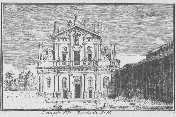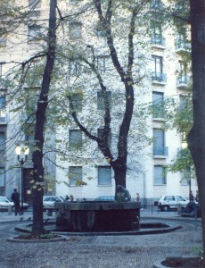 If you look at an aerial map of Milan, you find that the Church of Saint Angelo, which fronts on Piazza Sant’Angelo, has a religious complex of some size at its rear, placed around an oblong cloister. None of this is visible from the street or much known by the public. In 1939 Father Enrico Zucca had the Angelicum built beside the church, a large building in plain brick. This created a square too small for proper appreciation of the Church’s baroque façade which once, as the old print above shows, dominated the surrounding space. In today’s piazza, the high buildings surrounding it and the tall trees within it let in the rain while keeping out the sun. Surfing around on the internet for a suitable photo, I realized that this snap of my own, taken around 1987, tells a truth that my photographic skills would never have achieved if I had actually tried. The bright sun on the white buildings opposite fails to penetrate the grey cobbles, while the trees dwarf the figure of St. Francis hunched over the fountain, preaching to the birds, scarcely noticeable until someone points him out to you. And lastly – an almost Magritte-like touch – the street lamps appear to be lit in the middle of a Sunday afternoon. This, then is the scene that greeted the countless ex-pat Brits and Americans and young Italians thirsty for foreign culture as they queued up outside the Angelicum.