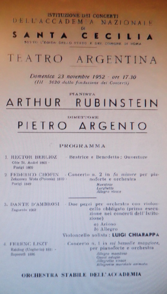 Before leaving the Rubinstein episode, it should be noted that Argento had accompanied Rubinstein at least twice before. The first occasion was at the Teatro Argentina, Rome, on 23 November 1952. Rubinstein played Chopin’s Second Concerto and Liszt’s First. The programme began with Berlioz’s Béatrice et Bénédict overture and the cellist Luigi Chiarappa played two pieces by the contemporary Italian composer Dante D’Ambrosi. The other occasion was less than a month before the Turin concert, on 30 April 1966 in Palermo, with the Orchestra Sinfonica Siciliana. Rubinstein played Franck’s Variations Symphoniques and Beethoven’s “Emperor” Concerto. The orchestra began with Rossini’s Il Signor Bruschino Overture and, rather enterprisingly, Morton Gould’s Two Spirituals. We must suppose that Rubinstein had fairly happy memories of the 1952 concert, otherwise why on earth should he have accepted two engagements with the same conductor fourteen years later?