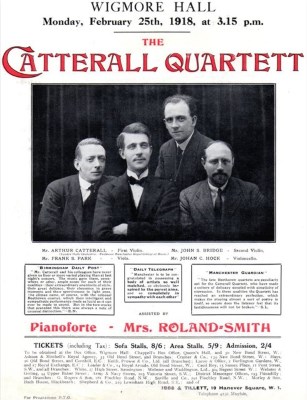 The Catterall Quartet travelled to Birmingham to open the new season of chamber concerts on 12 October 1915. The viola player, David Reggel had gone to work in America bringing about further quartet personnel changes. The resourceful Ernest O’Malley now replaced him and John Bridge (1872-1945) joined the ensemble as second violinist. Bridge was leader of the Hallé’s second violins and knew Catterall and O’Malley well. Catterall and Bridge shared a teacher in Willy Hess and they were both very active chamber musicians and soloists. After the quartet’s first concert, The Strad (November 1915) offered encouraging words saying, “The alteration makes surprisingly little difference to the balance of the quartet”. Two months later Catterall took his players to a venue he had avoided for so long. On 6 December the Catterall Quartet made their first appearance in Manchester playing works by Mozart, Debussy and Brahms. Of course, they were well received and whatever misgivings Catterall may have had about presenting his quartet to Manchester audiences were well and truly laid to rest.