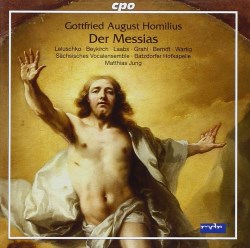 Much of Homilius’s music was not published. Before 2004, only a handful of CDs of featuring his works existed. There have been twenty or so recordings since (many from the Carus label), the latest of which is this CPO recording of Der Messias (The Messiah). My only prior experience of Homilius’s music was a recording of his oboe sonata. I found it not the most inspired music. This recording of Der Messias hasn’t changed my view – the music is pleasant but not at the same artistic level as similar works by Bach, if that’s a valid comparison.