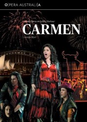 As I noted in my review of the recording of Handa Opera’s 2015 performance of Aida at Mrs Macquaries Point, Sydney Harbour, the location is spectacular. Location was all when Verdi had set the original to meet the stipulated criteria determined by the Egyptologist Auguste Mariette acting on the strict instructions of the Khedive of Egypt. However, the modernistic set and perverse costume policy were considerable downsides allied with inadequacies among the soloists (review). There were no such limitations with this 2013 staging of Carmen at the same open-air venue. The introductory opening (CH 1), to orchestral music from the opera, gives prominence to the view over Sydney Harbour towards the lit Harbour Bridge and the Sails of the renowned Opera House. We are also treated to a brief look at the tiered rows of the three thousand or so audience members. The setting is a curved bullring-shaped stage over the water, looking towards a backdrop of scaffolding carrying the reverse side of the title Carmen. The overture itself (CH.2) is itself visually spectacular. There's a flown lorry and a tank making a setting updated to a nineteen-fifties period staging. It's Franco’s Spain I guess, a view confirmed by the costumes. In act four, the bullring venue is highlighted by a large outline figure, in lights, of a toro (CH. 44). Each entr’acte is accompanied by spectacular Spanish style dancing by a large and appropriately costumed group. Castles-Onion’s tempi for the final act are at foot tapping speed (CHs. 42-44). This is followed by a splendid integrated firework display (CH. 45).
