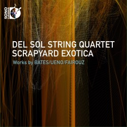 This set-up is something the work has in common with Steve Reich’s Different Trains, and indeed its sound world is not that far removed from the earlier work. The first of the four short movements, entitled “Rough Math” is highly and constantly rhythmic, its constant background beat overlaid with irregular figuration from the live instruments. The style owes a lot to several different genres of modern popular music. The second movement, “Scrapyard Exotica”, which gives the disc its overall title, employs pizzicato effects, but becomes more lyrical as it progresses. The musical language is resolutely tonal. Whilst the charming third movement, “Mating Dance”, uses the quartet more or less straight, without electronic interference, the fourth movement, “Viscera”, opens with the players “hitting” noises transformed into something that fairly closely resembles a drum kit.