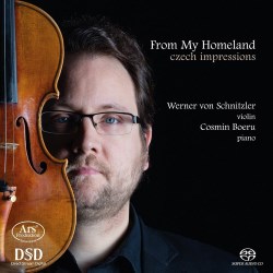 Don’t feel misled by the title of this disc. “From My Homeland” is the name of a work by Smetana, which arrives at the end of this satisfying recital of Czech chamber music. Bohemia is not, however, the homeland of the artists themselves; violinist Werner von Schnitzler, pictured on the cover right next to the title, is from Cologne, and pianist Cosmin Boeru is Romanian-born and now teaching in, again, Cologne.