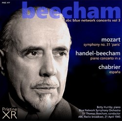 The third volume of this series (Volume 1 ~ Volume 2) traces a congenial concert of Mozart, Handel and Chabrier that is all over well within the hour. The central work is that hyphenated and hyperbolic construction, the Handel-Beecham Piano Concerto. In this the Bart has ransacked some memorable themes to stitch together a concerto of sorts, a vehicle for his new wife Betty Humby who here gives the work its first radio broadcast. The premiere had been given a little earlier, on 15 March 1944, again in New York. As Andrew Rose notes, Beecham and Humby recorded it in London the following year but he is not quite right in his dating. Most of the recording comes from January 1945 but the Romanza was set down successfully in October of that year (the then unpublished performance can now be found on Somm). There are no huge interpretative differences in as slight a piece as this, but it is noticeable that the very stately opening was tightened up a few months later in the London studio inscription. This charming work, full of rococo trills and burnished romance, is graced by excellent string playing – fully affetuoso when called for - an especially fine first flautist, and a few minor digital derailments from Humby. As picked up by the microphone, her piano tone isn’t quite centred in the balance; it tends to be a bit recessive.