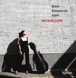 Natalie Clein is a great proponent of uncommon repertoire. She has recorded Kodaly's wonderful solo cello sonata and she has recorded Bloch's well known Schelomo, amongst many other things. It was news to me that Bloch wrote these three suites for solo cello. The works fill two thirds of this new Hyperion CD and this has given her the opportunity to fill up with two really unusual pieces by Dallapiccola and Ligeti. With her advocacy, a recording of startling realism, and a programme of such interest this ought to do very well indeed. I would go so far as to say that those who have not strayed far from the six Bach Cello Suites should pluck up the courage to hear this disc. The Bloch suites are imaginative, emotionally charged and not at all difficult to follow. The Dallapiccola piece shakes its fist a bit but falls comparatively easily on the ear. The Ligeti is an early piece, an unsuccessful gift to a girlfriend it seems, and apart from several unusual slides is no more of a challenge than Bartok and besides, it is only 8 minutes long.