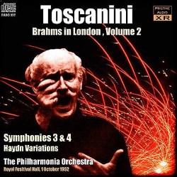 Arturo Toscanini's return to London in 1952 to conduct all the Brahms symphonies in a pair of concerts was considered of sufficient import to merit nationwide broadcast by the BBC. Pristine Audio's two-volume issue has similarly treated them as such an event, presenting all of the broadcast content. In this volume, besides the music, we get the commentator's announcements (too loud relative to the music); the playing of the National Anthem; and the interval feature, a prerecorded encomium to Toscanini by Sir Adrian Boult. This is why the total timings listed for the discs in the headnote add up to more than the durations of the actual performances.
