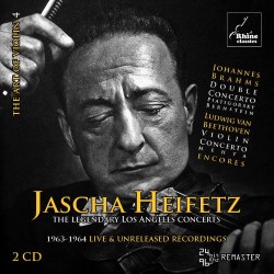 The Los Angeles concerts of 1963-1964 were given at the Hollywood Bowl, in which Heifetz and Piatigorsky played the Brahms Double with Leonard Bernstein, and at the Dorothy Chandler Pavilion where the violinist essayed the Beethoven with Zubin Mehta. Neither concert has apparently been issued before.