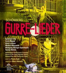 The casting overlaps that in the Chandos issue noted above, with Anna Larsson as the Wood Dove and Wolfgang Ablinger-Speerhacke as Klauss Narr in both. I preferred the Tove in the staged version of experienced Strauss and Schönberg singer, American soprano Emily Magee, to Alwyn Mellor for Chandos but in all other respects the singing is equally successful in both. Of course Ed Gardner does have the advantage in sheer numbers so the big moments are really big. I think the SACD sound is better than the Blu-ray but the latter has the inestimable advantage of pictures and subtitles which makes it so much easier to stay with the one-hundred-plus minutes of this huge piece in one's listening room at home. The large, fifteen minute, time difference is down to the presence of those extra words for the speaker and the final applause on the video, as much as it is to tempi.
