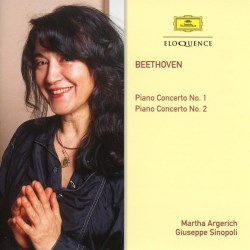From Giuseppe Sinopoli’s orchestral introduction to the first Piano Concerto it’s clear that the lyrical elements will emerge brightly and the bold majestically. You can appreciate equally the spacious brass fanfares and demure second theme (tr. 1, 1:20). The third theme, a woodwind march (2:21) is light and buoyant. The piano is closely recorded, strings nearby, wind set back a little, but all the orchestration is clearly detailed. The piano’s entry with the fourth theme (2:54), only heard here, is smooth but Martha Argerich soon livens up and, when mocking the first theme’s opening motif by adding appoggiaturas, is cheekily jocular. By contrast, her completion of the second theme, only part introduced by the orchestra, is quiet yet assured. There’s beautiful phrasing of rising and falling notes as the piano ruminates in the development. Argerich plays Beethoven’s short cadenza, lasting just a minute is a superb précis of the movement as well as showpiece. A thunderous recall of the opening motif melts into an affectionate wisp of the second theme, jolly entrance of the third theme then transformed by modulation before a stomping first theme opening motif returns, all festooned with the confetti of semiquaver runs, perfectly setting up Sinopoli's triumphant coda.