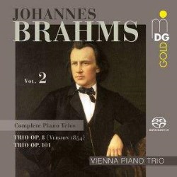 This fine SACD is Volume 2 of the 'complete trios.' Brahms wrote three numbered Piano Trios but the first, Op.8, was published in two versions. On this disc the Vienna Piano Trio perform the earlier 1854 version of Op.8 and it is coupled with the Piano Trio No.3 Op.101. Since Volume 1 (review) contains the later version of Op.8 plus the Piano Trio No.2 Op.87, one assumes they will stop at that and will not record the early A major Piano Trio that is attributed to him (though its authenticity has been questioned). The obvious SACD competition is the fine Guarneri Piano Trio on Praga Digitals who opted to record only the late version of Op.8, along with Nos.2 and 3, also on two discs, but added the A major as a significant makeweight. Their surround recording is perhaps a little less focussed than this new MDG issue but the performances are no less accomplished.