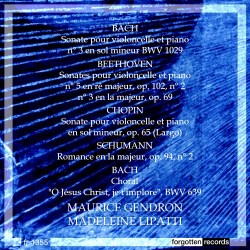 In November 1953 cellist Maurice Gendron gave a recital at the Salle Gaveau in Paris with Madeleine Lipatti (1915-1982), the widow of Dinu. A considerable pianist in her own right, she was sometimes known as the hyphenated Madeleine Cantacuzene-Lipatti. The broadcast was recorded and is presented here in very good mono sound and for once in a vintage broadcast the piano is excellently, indeed forwardly balanced.