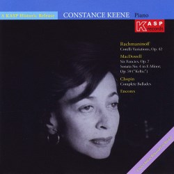 Constance Keene (1921-2005), born and bred in New York, was a significant figure on the music scene there for many years. By all accounts, she made rapid progress as a youngster on the piano, and at the age of thirteen Abram Chasins became her teacher. The two were later to form a duo and married in 1943, the same year that she won the Naumburg Piano Competition. Three years later, she deputized for none other than Vladimir Horowitz; she later claimed that she was the only female pianist ever to have been given this honor. The two became friends and often played bridge together. She also had connections with Arthur Rubinstein, tutoring his children. He said of her performances of Rachmaninoff's Preludes that he was "flabbergasted by the colour, sweep and imagination and ... incredible technique. I cannot imagine anybody, including Rachmaninoff, playing the piano so beautifully". She later taught at the Manhattan School of Music, serving as the Chair of the Piano Department and as a member of its Board of Trustees. She was also a well-respected piano competition adjudicator.