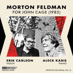 This is volume 6 of the Bridge label’s excellent Morton Feldman series, of which Piano, Violin, Viola, Cello (review), also with Aleck Karis, and Piano and String Quartet (review) have a permanent and prominent place in my collection. As the booklet notes for this release tell us, For John Cage is the second of seven works that Feldman dedicated to artists, and the cover photo bears witness to a friendship that lasted from 1950 to Feldman’s death in 1987.