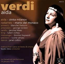 a previous review: “ I am going to enter the lions' den by saying that I do not hear in Milanov's Aida the paragon referred to by so many previous reviewers. To me, she frequently sounds elderly (yet she was not yet 50 at the time of the recording), wobbly and screechy; listen to her in the first trio with Bjőrling and Christoff (both superb); her first aria, ‘‘‘Ritorna vincitor’ is full of swoops and slides - listen to the attempt to hit the A at 2'.08" or the G at 2'. 29"; they are pretty gruesome. Yes, I know that singing Aida is not just about hitting a few notes correctly but to my ears she is struggling throughout, compared with the vocal sumptuousness and security of Price or Caballé. In fairness, Milanov's ‘Patria mia’ goes better but she still slides and loses tonal quality too often. The concluding Tomb Scene finds her and Bjőrling striking sparks off each other, but it is often a bumpy ride.”