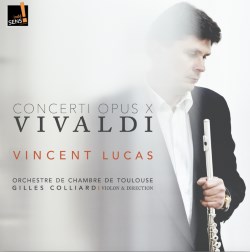All this explains the interest value of the accompanying liner notes for this new CD by Vincent Bernhardt, a professor of organ and basso continuo as well as a busy practicing musician. He goes into considerable detail about the sources of these six flute concerti and after reading, there might be many Vivaldi enthusiasts who will be seeking out performances of yet more concerti to hear how much they differ. I should add that Vivaldi wrote quite a few more concertos for the flute including at least one for two flutes that are not part of the Opus 10 set. To add more complexity, the descriptive title carried by Op.10 No.1 is used again by Vivaldi for an entirely different concerto, Op.8 No.5 for violin and strings. For all that this set of concertos was mostly not original and put together in a hurry, the character of each work is distinct, ranging from the dramatic to the gently lyrical and often displaying the composer's penchant for musical scene painting. Nothing in these twenty-one movements - No.2 has six movements - is remotely dull and one is often struck by the beauty of the slow movements as well as the fierce virtuosity of the fast ones. Fierce virtuosity is very much what one gets in these modern performances. Vincent Lucas is the proud owner of a Muramatsu flute and he does make the most beautiful sound with it even when playing at breakneck speeds. The Toulouse Chamber Orchestra add lustre to an already burnished reputation and match Lucas mood by mood with a spectacular display of what one might call historically informed modernism. The performances are never heavy but always crisp and cleanly executed. It would probably not be possible for a period player to play this fast and that gives the disc a dynamism that has to be heard, even by the HIP enthusiast.