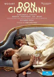 The singing and acting is good throughout, the former aided by the cast not having to strain in a theatre of a thousand or more. Marlin Miller as Ottavio is less of a wimp than usual, but has to reach somewhat for his high notes. Myrtò Papatanasiu’s Anna is good with Carmela Remigio’s Elvira not always quite as reliable vocally. As Zerlina, Manuela Bisceglie has an appealing stage presence and a well-supported lyric voice. Masetto, her intended sung by William Corrò, has vocal appeal, his baritone contrasting with the deeper tones of the eponymous role and that of his servant. Andrea Concetti as Leporello and Ildebrando D'Arcangelo as the Don are very similar in vocal tone - useful when they exchange clothes each taking the role of the other. But it is the suave-toned and brilliant all-round characterisation of Ildebrando D'Arcangelo which dominates his rather plainer partner. Lithe of figure, and moving like a born stage animal, he dominates the stage when present. His singing is, on occasion, not as mellifluous as some famous predecessors, but pretty good all the same. How far any limitation is caused by Riccardo Frizza’s sometimes-rushed tempi is debateable. Certainly his conducting does not erase memories of one or two more natural Mozartians of yesteryear in this work.