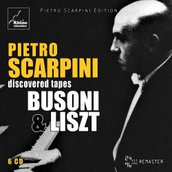 Having recently reviewed a 2 CD set of Pietro Scarpini playing Mozart on the Rhine Classics' label, I'm please to have the opportunity to do the same for this more ambitious 6 CD set of the pianist's Busoni and Liszt recordings. Once again the recordings derive from 'discovered tapes' and constitute another fascinating volume in their Pietro Scarpini Edition. Unusually, the pianist seemed to steer clear of commercial recordings, opting instead for home recordings of his concerts and radio broadcasts, which he meticulously catalogued. For those who know little about him, he was born in Rome April 6, 1911. He was fortunate having a mother who was a pianist, and she guided him through his first steps. He went on to study at the city's Accademia di Santa Cecilia, where his teachers were Alfredo Casella for piano, Ottorino Respighi for composition, Alessandro Bustini for conducting, and Fernando Germani for organ. A solo career beckoned, and he was lauded as “a new star in the international sky of pianists”. After the war, he developed an interest in contemporary music, with composers such as Hindemith, Dallapiccola and Schoenberg featuring prominently. Another was his fellow compatriot, the Italian composer, pianist and conductor Ferruccio Busoni, as this raft of recordings of music by him bears testimony. Scarpini retired from the concert platform in the late 1960s but continued to give master classes and teach in Siena and Darmstadt. After a series of health problems, he died in November 1997.