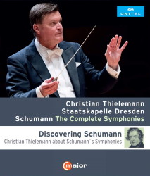 The versions by the Berlin Philharmonic under Rattle (Berliner Philharmoniker Recordings, 2014) are quite outstanding, perhaps the best of all. The expensive package has multiple sound formats in addition to the film, including Blu-ray audio, CDs, and access to downloads of the studio master audio files. But that recording is not strictly comparable, since it has the first, rather different, 1841 version of the D minor symphony (which became the No.4 we know only when revised a decade later). This is valuable in itself, as are Rattle’s thoughts in interview as to why he prefers it. The performances overall are as swift as the Bremen ones, for as Rattle says “you can be incredibly profound without being heavy or slow”. So we now have three very valid Blu-ray sets of these splendid works. Suffice to say that this new Dresden one is also very fine on its own terms.