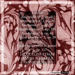 Fauré composed two cello sonatas and here we have No 2 in G minor. André Navarra is partnered by the French pianist Annie d'Arco. The opening movement bristles with energy and fluidity. In the slow movement the cello's sombre lament is accompanied by a funereal tread. By contrast the finale is bright and breezy.