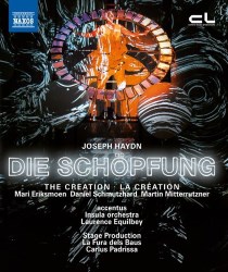 Padrissa is a film and stage director working with his Catalan company La Fura dels Baus. He has extensive experience in operatic stagings (notably the Valencia Ring Cycle under Zubin Mehta) and seems, from the interesting bonus documentary, to have relished the challenge of an oratorio that the composer can never have expected to be presented as staged drama. The chorus are wandering refugees, besmirched and frightened or amazed by turns. The three soloists move through the stage space, fly and even submerge themselves whilst in full, indeed spectacular, costume. The memory of Adam and Eve starting their long duet completely underwater - no singing at this point! - and ending up high above the stage (dripping copiously), all without missing a note, will stay with me. I suspect Mari Eriksmoen and Daniel Schmutzhard will also remember this, hopefully with pride at their own achievement. All this movement is accompanied by a handful of stage props. Unlike the above Ring, there are no acrobats, just these: a tablet computer for each member of the chorus, a couple of dozen large balloons, a stage crane for the flying, a tank of water, gauzes and lots of lights.. These allow us to see solar systems, starbursts, a large beetle, myriad patterns, philosophical epigrams, the list is very long and Padrissa rarely repeats himself. After recoiling at first sight of all this, I stuck with it and ended up quite moved by the cumulative experience of Haydn's great finale chorus "Sing the Lord, ye voices all".