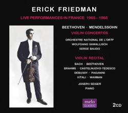 This twofer offers a before-and-after-Moscow look at Friedman’s Parisian concerts from 1965-66 and 1968. From Besançon comes the Beethoven Concerto with the Orchestre National de l’ORTF directed by Wolfgang Sawallich. This is in good sound and captures some audience participation (typical rustling). The distinctively reedy tone quality of the winds is also noticeable as is Friedman’s fast vibrato and the taut intensity of his tonal production, a direct inheritance from Heifetz. The conductor brings out some military march patterns that aren’t always audible in the first movement and stamps his characterful musicianship on the music-making to advantage. Friedman depicts the slow movement with expressive directness, the swelling vibrato and echoes of Heifetz’s hooded attack being clear. Notwithstanding, there’s something rather manufactured about elements of the phrasing. The finale goes with spirit, rhythmically vibrant and with finely judged dynamics.