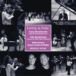 Fanny & Felix is this disc’s title though at least one CD retail website lists it as “Felix and Fanny”, perhaps in a nod to the presumed precedence of an earlier era. Felix has just the one work on the disc, but still dominates in terms of playing time, his big Double Concerto (with its eighteen minute first movement) needing more than all of the four songs and the string quartet by his brilliant sister. Those songs are arranged for viola and piano. The quartet is arranged for string orchestra, although we are not told by whom. The Swedish string orchestra, Musica Vitae is directed by violinist Malin Broman, who also plays the viola for the songs, accompanied by pianist Simon Crawford-Phillips. Broman and Crawford-Phillips are the soloists in Felix’s Concerto for Violin, Piano and String Orchestra.