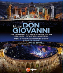 The prospect of a Mozart opera performed in the massive setting of the Arena di Verona certainly makes one think of the word “curiosity”. After seeing and hearing this disc, I have not changed my mind. The musical side of things is constantly challenged by the distances in the open-air setting. It is also necessary to mike the singers closely, and that does little to change the impression that everyone is struggling. There are frequent instances of ragged ensemble in both the orchestra and the soloists. The microphones used in this recording place each voice under an unnecessarily harsh spotlight. That is then mixed with a powerful echo, part of the natural acoustic of the Roman amphitheater. The talent involved here is such that I would hope to encounter many of these performances again under better conditions. It would be unfair to judge the singing of the principals in these circumstances, so I choose to confine myself to commenting on the production rather than the musical merits of this disc.