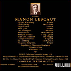 In the pit is Björling’s favourite conductor, Nils Grevillius, who followed the tenor’s during all of his career and conducted the orchestra for most of his Swedish recordings, from his first in 1929 to his very last recorded concert only a few week before he passed away. The last track of the bonus numbers is from that occasion. He paces the score well, occasionally on the slow side, but holds the performance together admirably. Richard Caniell’s restoration is convincing and even though the sound can’t quite compete with studio recordings of the same vintage, it is eminently listenable. We have to be grateful for his endeavours to create this worthy tribute to one of the greatest tenors of all times. As a bonus, which further enhances the importance of this issue, we are treated to ten numbers from the last decade of Jussi Björling’s life. There are no additions to his recorded repertoire, but several of the recordings are not easy to get hold of. What they have in common is the glorious singing of Jussi and it is always with a large portion of melancholy one listens to Kuda, kuda from Eugene Onegin – sung in Swedish – from his very last recorded concert. In the opera Lensky sings the aria in the morning, just before a planned duel with his friend Onegin, and Lensky has a premonition of that he will die in the duel. With hindsight we know that five weeks after this concert Björling died in a heart attack. Some of the bonus numbers have been proposed by Norwegian Björling-fan Kristian Krogholm, a man with encyclopaedic knowledge of Björling’s life and inveterate collector of his recordings. He has written liner notes on the bonus numbers in the accompanying booklet, which also contains Stefan Johansson’s reminiscences of the actual Manon Lescaut performance, which he saw when he was twelve; a brief Memorial of Jussi Björling by Richard Caniell, a detailed synopsis with cue points, and recording notes by Caniell.