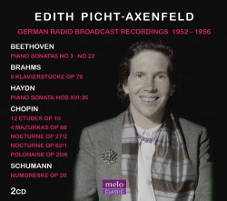 The rarely performed Piano Sonata in C sharp minor by Haydn happens to be one of my favorites, so I’m more than happy it features here in a radio broadcast from 24 April 1956. Picht-Axenfeld makes a good job of the elusive and rhythmically quirky first movement, contrasting the opening belligerence with the more placatory elements to come. From four years earlier we have two Beethoven Sonatas. Op. 2 No. 3 requires technique of the highest order, and this it gets, with all the virtuosic challenges delivered with panache. The slow movement is eloquently expressed, and the semiquaver runs in the finale sparkle with glitter and precision. The first movement of Op. 54 is nicely paced, with the octaves in the stormy trio precise and clearly articulated. The toccata-like second movement is thrilling, and there's a sense of exhilaration in the closing dash to the finishing line. Brahms alternates capriccios with intermezzos in his Op. 76 Piano Pieces. Here, the latter are lovingly contoured and lyrically drafted. The final Capriccio, rife with dissonance, builds up to an electrifying climax, but this performance will never displace my top recommendation for this cycle, namely that of Stephen Kovacevich.