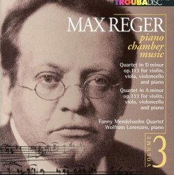 This synthesis can be clearly seen in the two piano quartets, and whilst the D minor Quartet of 1910 is clearly influenced by that of Brahms, for Reger it is an attempt to find a new and more modern approach to composition whilst using the existing tonality. Rob Barnett, in his review of the MDG recording with Claudius Tanski and the Mannheimer Streichquartett (MDG 336 0715-2) states that “Its passionate auburn turbulence too often plunges into the mire of density - relenting occasionally but not often enough.” And although it does have symphonic leanings, here I disagree, although for me this recording quality is slightly dense. The recording is too quick in comparison with my other two recordings, the MDG and the Aperto Piano Quartet on Naxos (8.570785), knocking around five minutes off the mammoth first movement alone, making it more of an allegro than its Allegro moderato. I much prefer the pacing and less reverberant sound of either of my other two versions, the less hurried approach adding a little more clarity to both the clarity and the sound. The vast canvas of the opening movement is followed by the Vivace-Adagio-Vivace, which Reger himself described as a kind of “crazy scherzo.” But it is in the Larghetto third movement that the present performers take the most liberties, with it again being too fast, four and a half minutes too quick to be exact, so that it loses too much drama and pathos; instead it becomes just another moderate movement, this despite a nice presentation of the opening statement. For me, it is the final Allegro energico with its theme of shifting tonality, that offers the best music, and which is performed best here. There are many fine ideas here, I particulary like the way Reger shifts his thematic material as it leads towards the powerful coda.
