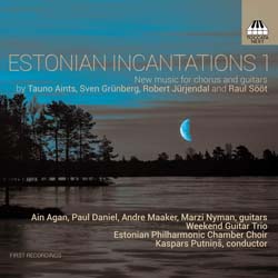 In CD terms rarely is the phrase “And now for something completely different” more apt than with this disc; choral works accompanied by one or more guitars. The idea for the disc came from Ain Agan who plays fretless guitar on the record and who organises the guitar festival in Viljandi in southern Estonia. He wanted to create something different for the festival and this he has certainly achieved.