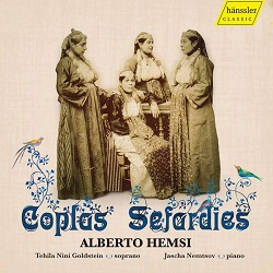 Tehila Nini Goldstein has a fine voice, rich (but never too heavy), with a range of attractive colours. She can be tender, as in ‘Durme, durme hermosa donzella (disc 1, track 2), playful, as in ‘Estávase la mora en su bel estar (disc 1, track 12), or lyrically melancholy, e.g. ‘Mi alma triste’ (disc 3, track 11). Everywhere, like the experienced Lieder singer she is, she is attentive both to the melodic line and the precise meaning of the text she is singing. The work of pianist Jascha Nemtsov is exemplary, inflecting Hemsi’s writing for the piano with just the right Spanish ‘flavour’ (at times the sound is reminiscent of de Falla) and the link between vocalist and accompanist seems to operate at the level of intuitive empathy. Appreciation of their work (especially that of Tehila Nini Goldstein) is greatly aided by the documentation Hänssler provide. The text of every one of the 60 songs is followed by a note – some of them as long as half a page – commenting on the social context or on the specifics of text or music. Some of these notes are by Hemsi himself, taken either from the original individual publications of his collection or from the collected edition, edited by Edwin Seroussi and published in Jerusalem in 1995. The remainder are by Jascha Nemtsov.