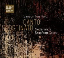 The Dutch Saxophone Octet is a young ensemble founded in 2014 by recently graduated players, and Canto Ostinato one of the first pieces they took to concert venues. Arranged by saxophonist Stefan de Wijs, the booklet note points out a difference in playing with eight musicians rather than between one and four: “our Canto has far more opinions… [and] each player brings his or her personality and colour. Together, we form an organic machine with organic components that communicate closely with each other. At one time everybody follows an initiative in articulation in dynamics, at another time, one player goes solo against the rest. But each time it goes forward, and then it retreats; it builds tension, and then it retreats. In eternity.”