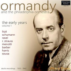 Focusing on his orchestral recordings, rather than the better-known concerto accompaniments he provided, this is the first volume in a new series devoted to Eugene Ormandy’s early years with the Philadelphia Orchestra. In temporal terms this twofer covers the years from 1936 to 1942 in 78s made for Victor. Of some interest to admirers of the conductor is the fact that he never re-recorded the pieces by Schumann (rather surprisingly), Menotti, Barber and Harris.