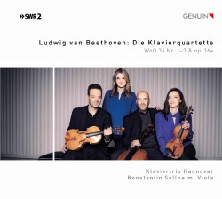 The answer is, I think, quite straightforward. While Beethoven wrote a number of piano trios throughout his creative life – from the early Op. 1 set, to the ‘Ghost’ Trio, Op. 70 No. 1, and culminating with the epic ‘Archduke’, Op. 97, these have all been recorded by virtually every ensemble at some time or another, whereas the composer wrote only three independent piano quartets – early works which, as the paragraph above confirms, are little known. Yet, despite these first quartets being written when Beethoven was a mere 15 years of age, there are already enough pointers to show how his compositional style would develop, through his three so-named periods of composition. Furthermore these eminently melodious early piano quartets simply ooze pure enthusiasm and youthful verve, something which Klaviertrio Hannover and guest-violist Konstantin Sellheim, not only have in great abundance, but also the matching technical prowess to play them with such consummate gusto.