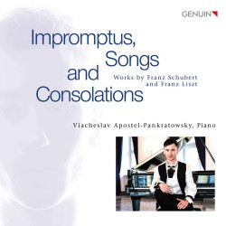 Apostel-Pankratowsky plays the very familiar and heavily recorded first set of Impromptus and does so with considerable skill and empathy for the music. No one listening to these wonderful works for the first time through these performances will be disappointed but I’m afraid that there are so many great pianists who have recorded these works, some like Brendel several times, that it’s a harsh reality that he isn’t yet in that class. I’ve every confidence that he will attain this level in due course. However, I particularly liked the final Impromptu in A flat and would certainly have enjoyed hearing this pianist live. The transcriptions of the Schubert songs seem to me very successful. He is very powerful in the “Barcarolle” (To sing upon the water) which takes us on a gondola ride but across a rather stormy lagoon. I was taken by the arrangement of “Hark, hark the lark” and it certainly shows Liszt’s skills at transcribing the songs to piano. The famous “Gretchen am Spinnrad” is based on part of Goethe’s “Faust”, such an inspiration for composers up to Mahler - a natural successor to Schubert. Whilst lovers of the original songs may demur and whilst I appreciate the qualities of Schubert’s songs sung by the likes of Fischer-Dieskau and Janet Baker, I feel like the subject of Keats’ poem “On First Looking into Chapman's Homer” that I don’t understand the native language. These transcriptions are beautifully composed and I very much enjoyed the playing here. There’s the lovely Viennese lilt of “Ständchen", D889, followed by “Ave Maria” which always evokes that memorable final scene in “Fantasia”. Apostel-Pankratowsky has chosen a very suitable selection of the song transcriptions. The recital is rounded off with the “Consolations” composed after Chopin’s premature demise and upon Liszt’s retirement as a virtuoso performer. They are very different from what I’m used to expect from Liszt and as the notes point out, they are lyrically expressive in character, whilst expressing emotion with finely wrought piano-writing. I don’t know these works very well although I do have them in a complete Philips set of recordings by Alfred Brendel. They are very thoughtfully played; this is clearly a pianist who has a very promising future. As well as the notes, biography and interesting photos, the project is successful with an admirably clear recorded sound.