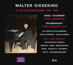 Izler Solomon and the Los Angeles Philharmonic also partner Gieseking in the Grieg Concerto. Once again, a studio recording with Karajan exists from 1951 in addition to one with the Berlin State Opera Orchestra directed by Hans Rosbaud from October 1937. It's the least successful of the concerto performances in the set, marred by some untidy passagework from the pianist and some orchestral playing which, at times, seems unrehearsed.