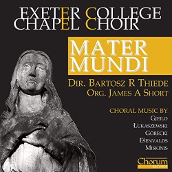 Bartosz R Thiede hopes that this album will introduce those kind enough to listen to at least one track that they were not familiar with. If you find a track you have particularly enjoyed, please let him know. I was particularly taken by the Łukaszewski, The Mass and the final Gorecki. When I want quiet contemplation and to be taken back to Oxford, via Poland, I will reach for this disc. Throughout, as well as the splendid choir, there is fine organ playing by James A Short. I look forward to seeing Thiede progress; meanwhile here is a fine statement of his time at Exeter College Oxford.