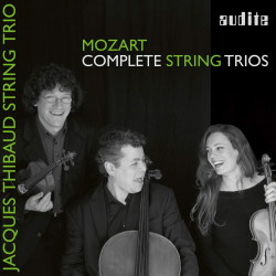 Enter the Jacques Thibaud String Trio; their spirited yet extremely musical account has distinctive qualities and certainly dragged me out of my comfort zone. I’m familiar with a couple of their previous Audite discs of twentieth century fare (invigorating Milhaud and Martinu - review, and a collection of Reger, Dohnanyi, Kodaly topped by the magnificent, underappreciated trio by Jean Cras on AUDITE 97534) and their open-hearted, vivacious playing on those issues is present here in spades. In my experience the Audite engineers typically strive for a sound picture which leaves little to the imagination, a vivid, close-up image which in many cases approaches what one might hear in a live recital sitting close to the stage. It is an approach which can pay thrilling dividends (eg in the outstanding Mendelssohn cycle by the Mandelring Quartet (review) and in many of the Quartetto di Cremona’s fine Beethoven Quartet recordings). In terms of the present issue my initial impression on hearing the opening bars of the Divertimento’s initial Allegro was that the alpine freshness comes at the expense of domestic intimacy, especially compared to the Hyperion disc. But it’s extraordinary how quickly the ear adjusts and one settles back to enjoy the Thibauds’ scintillating, characterful playing. The beating heart of the work surely lies in the great second movement Adagio; I was aghast to find the Thibauds’ clip three and a half minutes off the Leopold’s timing for this panel – it certainly doesn’t feel too fast. In terms of comparing the two performances I suspect listeners’ preferences are more likely to be determined by the very different sonics – the exquisitely realised chamber mood of the Hyperion or the concert hall precision of the Thibauds. The latter are wonderfully lithe and mobile in the two Minuet movements whilst they find elegance and wit aplenty in the delicate intricacies of the theme and variations of the Andante that separates them. Their Allegro finale is robust and refreshing. If Mozart’s solo writing is unusually virtuosic for a string trio (as the booklet suggests) the Thibauds’ approach utterly eschews unnecessary showiness but retains a level of compulsive excitement. I was certainly glad to have made the acquaintance of this new reading of the Divertimento – although it is unlikely to displace the Leopold Trio’s account in my affection it offers a valid, bracing alternative. Perhaps one that’s better suited to the quality speakers in the living room, enabling the connoisseur to reserve the Leopold disc for cold winter West Pennine nights under the duvet with a decent pair of headphones and a tot of Jura.