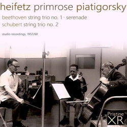 Despite featuring solo instrumentalist of the highest calibre, on issue these recordings were clearly badly compromised by their inferior sound. Beethoven’s String Trio No. 1 was recorded in mono at a different Hollywood location from the other two, which were made in stereo but still suffered from dry, hard, edgy sound; Pristine’s aim, therefore, was to remedy that by remastering them into Ambient Stereo, which is almost invariably an unqualified success.