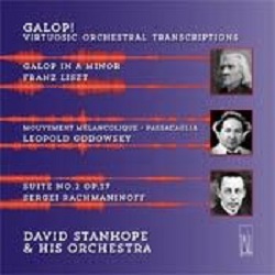 these virtuoso keyboard works. The Liszt Galop is something of a helter-skelter musical rollercoaster. Musically it is rather insubstantial with its main pleasure being derived from appreciating the skill it takes to perform. Of course a computer is completely indifferent to that aspect so rather undermining the impact. There is a manic figuration early on arranged for violins and hyper-active xylophone that would simply never be performed with the level of unanimity you hear here. If it were, you would have an audience out of their seats but knowing its a computer leaves me cold. The two transcriptions of works by Leopold Godowsky are substantially more impressive as pieces of music. I had not heard either in their original solo piano forms. The Mouvement Mélancolique is the title Stanhope has chosen to give his arrangement of the last movement of Godowsky ’s epic Piano Sonata. Moving on now from my concerns with the actual sound here, Stanhope has created an impressive and compelling arrangement in its own right. The music suits the tonal and registrational variety an orchestra can provide and Stanhope is very adept at exploiting the range of instrumental colours at his command.