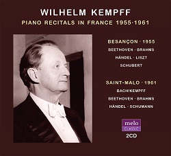 These two piano recitals, set down in Besançon in 1955 and Saint-Malo in 1961, come on the back of another 2 CD set released by Meloclassic about three years ago, also titled “Recitals in France” and recorded between 1959 and 1967 (review). Once again, the repertoire chosen sits well within Kempff’s comfort zone, with Beethoven, Brahms and Schumann being the mainstays. As with the previous release, these live recordings provide a valuable and welcome addition to the pianist’s discography.