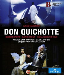 Gábor Bretz is a very successful Quichotte. His sings with warm tone and truly managed to emulate the French style that is required for this role. This is a fairly remarkable achievement for a non French singer. His ability of capture French style is all the more striking considering that I recently reviewed another Massenet opera on DVD where a native born French singer made no attempt to deliver that sort of nuance in his singing. Bretz’s delivery of the charming song to the star is as delicate and tender as one could ever wish to hear. David Stout is a totally endearing Sancho Panza. The different guises that he has to adopt in each of the acts do not manage to hide the warmth of his characterization and his singing is superb. In this staging he becomes even more important as he is the steady anchoring feature that brings some unity to the disparity from one act to the next. Anna Goryachova is an absolutely stunning Dulcinée. Her skills as a Rossini mezzo come to good use in this role which requires a certain degree of viruosity to come off as the composer intended. Her scenes simply crackle with excitement and allure. It is no wonder that Quichotte is so taken with her. Her striking vocal performance puts her generally ahead of both Régine Crespin and Teresa Berganza on the Decca and EMI audio recordings of this work. I would still suggest that Crespin should be heard for her mastery of nuance, even though her voice was beginning to decline when she recorded the opera. The rest of the cast of minor roles are all exceedingly well rendered with no one person sounding unsuited to their role. Daniel Cohen brings real panache to his reading of the score, and he receives accomplished support from the musicians of the Wiener Symphoniker. The Preludes to each scene are miniature scene paintings in themselves and Cohen captures their moods brilliantly. The sound and picture of this Blu-ray are absolutely top notch and quite equal to C Major’s high standards in this area.