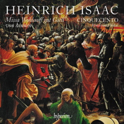 I’ve had a look around but couldn’t find any current alternatives on record to Isaac’s Missa Wohlauff gut Gsell von hinnen, so acquiring this disc will enter you into a pretty exclusive club. Separated by the Josquin Comment peult, the rest of the programme is taken up with three of Isaac’s motets, and these are by no means mere fillers. David J. Burn’s excellent booklet notes indicate that some of the music has been attributed to other composers, and the final Judea et Jerusalem may indeed be by Jacob Obrecht. None of this detracts from the sheer quality of what we hear, aptly summed up in the notes as music that “illuminates the sacred mysteries of its text from the inside.” Such illumination would not be possible without the superb voices of Cinquecento, and Hyperion’s excellent recording, which is perfectly balanced in a spacious acoustic, but close enough for that all-important clarity of diction and line to be communicated without any need to strain the senses.