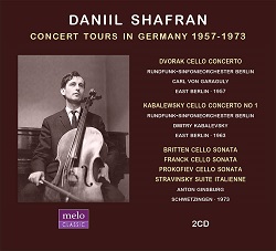 This is the second volume of Daniil Shafran’s live airings emanating from the Meloclassic stable that I’ve had the pleasure of reviewing. As in the previous single volume (review), this 2 CD set features recordings sourced from German radio. The cellist has become something of a cult figure amongst fellow players and collectors. His highly individual style has polarized opinion but admirers, like myself, hold him in high regard and continue to enjoy his recorded legacy. He was born in Petrograd — later Leningrad, then Saint Petersburg in 1923 — to musical parents. His father, Boris, was principal cellist of the Leningrad Philharmonic Orchestra, and his mother, Frida, played the piano. After some initial tuition from his father he went to study at the Leningrad Conservatory. In 1937 at the age of only 14 he won first prize in the National Competition for Violinists and Cellists held in Moscow. Defeating all the adult participants he was awarded a 1630 Amati cello that he played for the rest of his life. For the remainder of his career he was overshadowed by Mstislav Rostropovich due to the fact that he didn’t really cultivate a career in the West like many other contemporary Soviet artists. That said, he did make the occasional tour of Europe, USA and Japan. He recorded mainly for Melodiya, noted then for its poor LP pressings and limited distribution. He died in 1997.