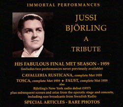 Let me say at once that this is a magnificent tribute to Jussi Björling, issued in connection with the celebrations of his 110th anniversary in February 2021. One would have thought that the enthusiasts had already scraped the bottom of the barrel and found what remnants there were, which could be restored to acceptably listenable status, but here Richard Caniell has come up with some highly interesting material that has only been available on obscure LP issues in execrable sound. Of main interest are of course the three complete performances from Jussi’s last season at the MET in November and December 1959, less than a year before he passed away at age 49 in September 1960.