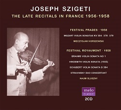 These two recitals from the Prades Festival 1956 with Mieczysław Horszowski and the Royaumont Festival 1958 with Naum Sluszny came late in Szigeti’s career. He was now in his sixties, and throughout this decade he’d begun to develop arthritis in his hands, resulting in a progressive deterioration in his playing. In mitigation, however, his formidable intellect and musical expression remained intact, and his audiences continued to pack the venues in which he appeared. Between these two recitals, in 1957, he was invited back to Budapest by the communist regime to give concerts. Although he hadn’t visited the city since 1939, he vowed never to return “until Hungary is free”.