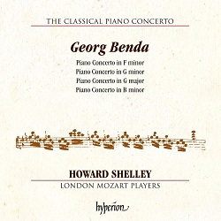 Hyperion’s long-standing Romantic Piano Concerto Series currently numbers over eighty-three examples, since its inception in 1991. In 2014 it introduced a parallel series, dedicated to Piano Concertos of the Classical Period, and at the time I had great pleasure reviewing a CD of three piano concertos by Dussek, performed by that veritable champion of concertante underdogs, Howard Shelley, with the Ulster Orchestra. Seven years on, the series now encompasses eight CDs, the latest featuring four piano concertos by Georg Benda, again with pianist / conductor Howard Shelley, but with the London Mozart Players.